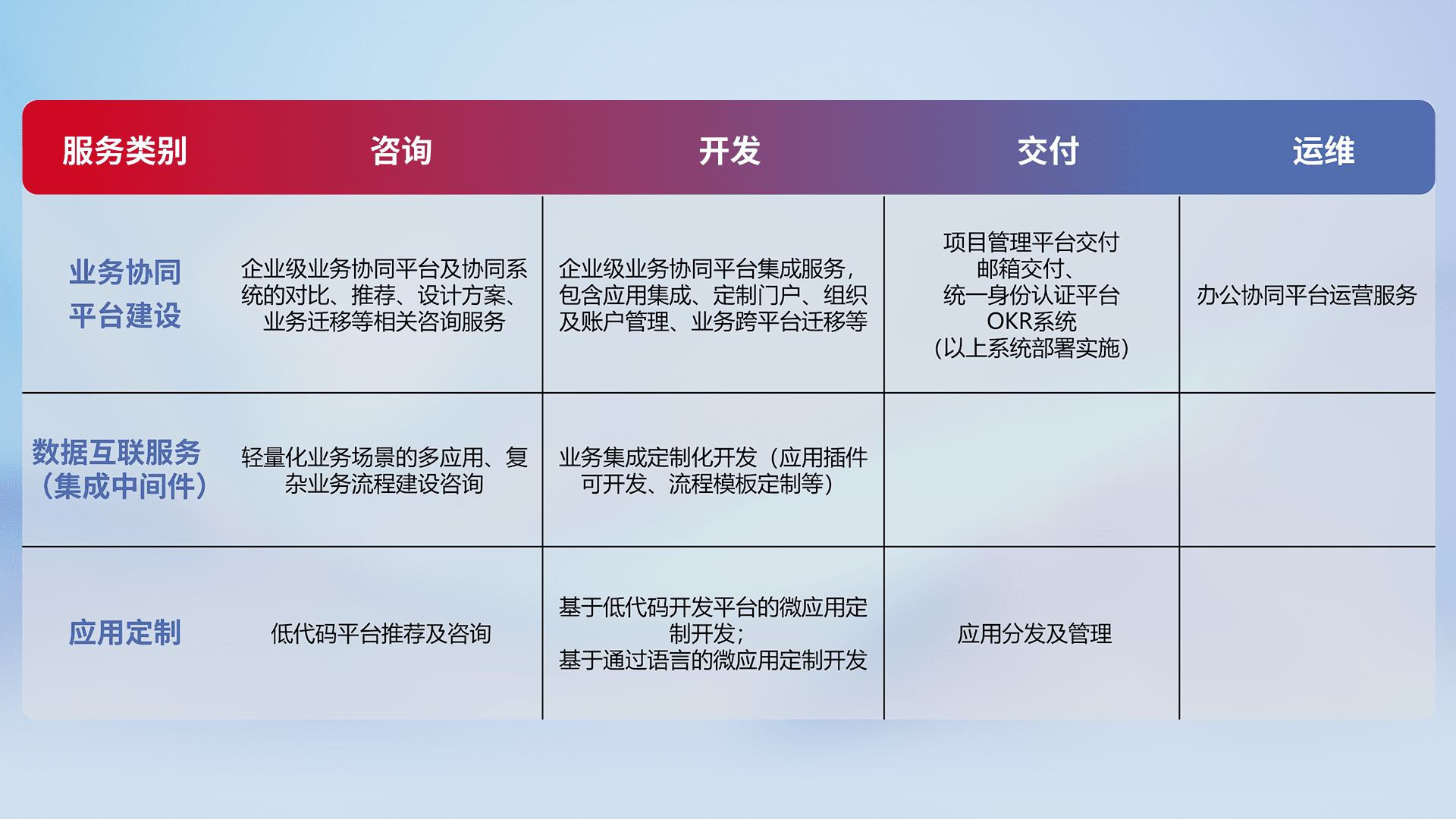 针对钉钉、、、企微、、、IDaas等平台级产品提供产品的规划、、、、方案、、、、交付、、、、定制化开发等服务,,,实现如统一协同办公、、、、智能客户服务、、、、混合会议管理、、、智能数据查询、、等业务场景,,,,实现数字化转型。。